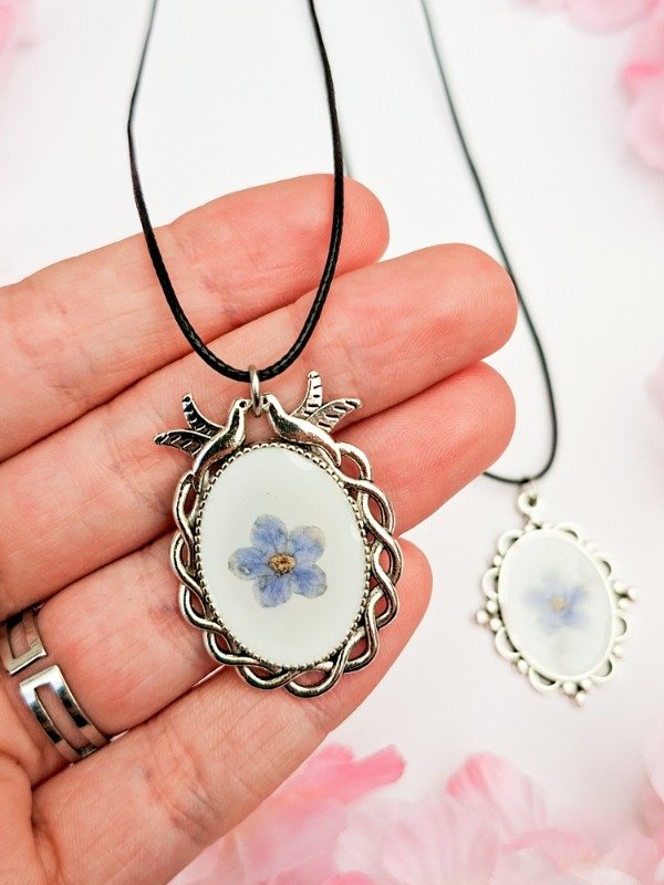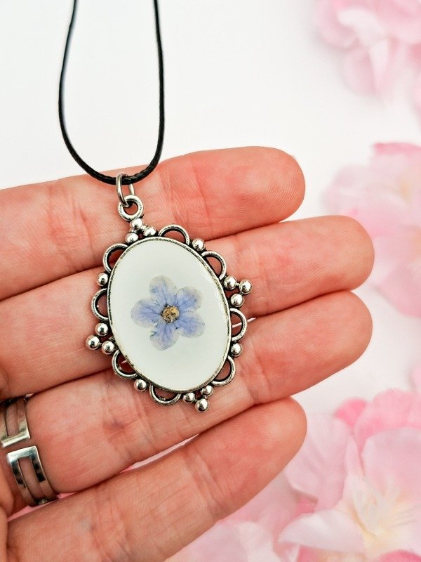 Collar regulable con dije artesanal de resina con flor natural.